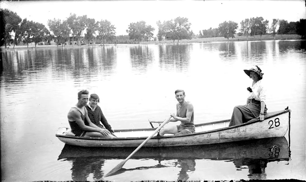 Campers in a canoe at City Park Lake in Denver sometime before 1916.