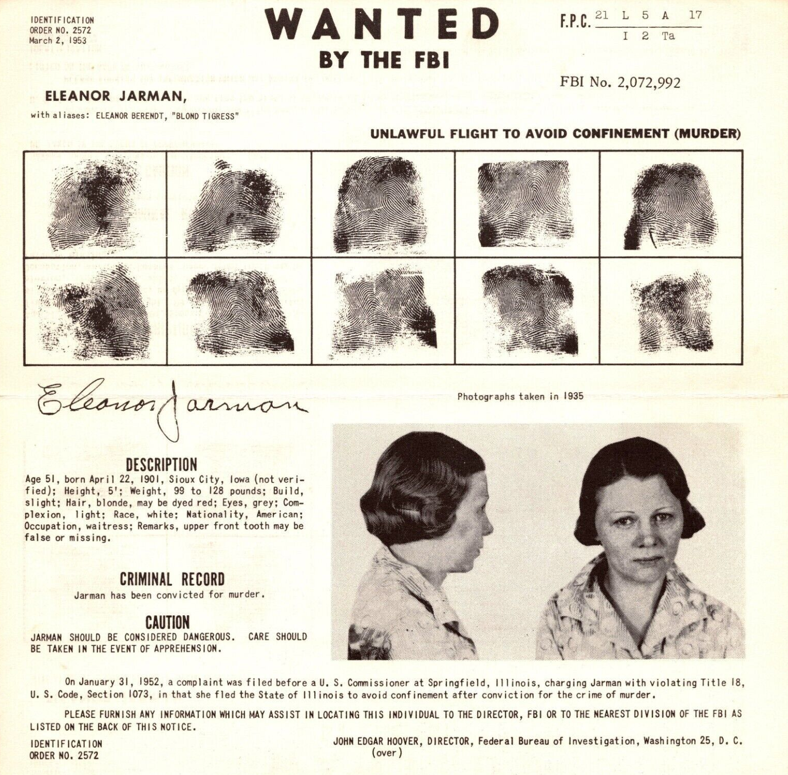A 1953 wanted poster for Eleanor Jarman. It was issued after a complaint filed in January 1952 alleged that Jarman had left Illinois. In 1951, Marie Millman appeared in Colorado.