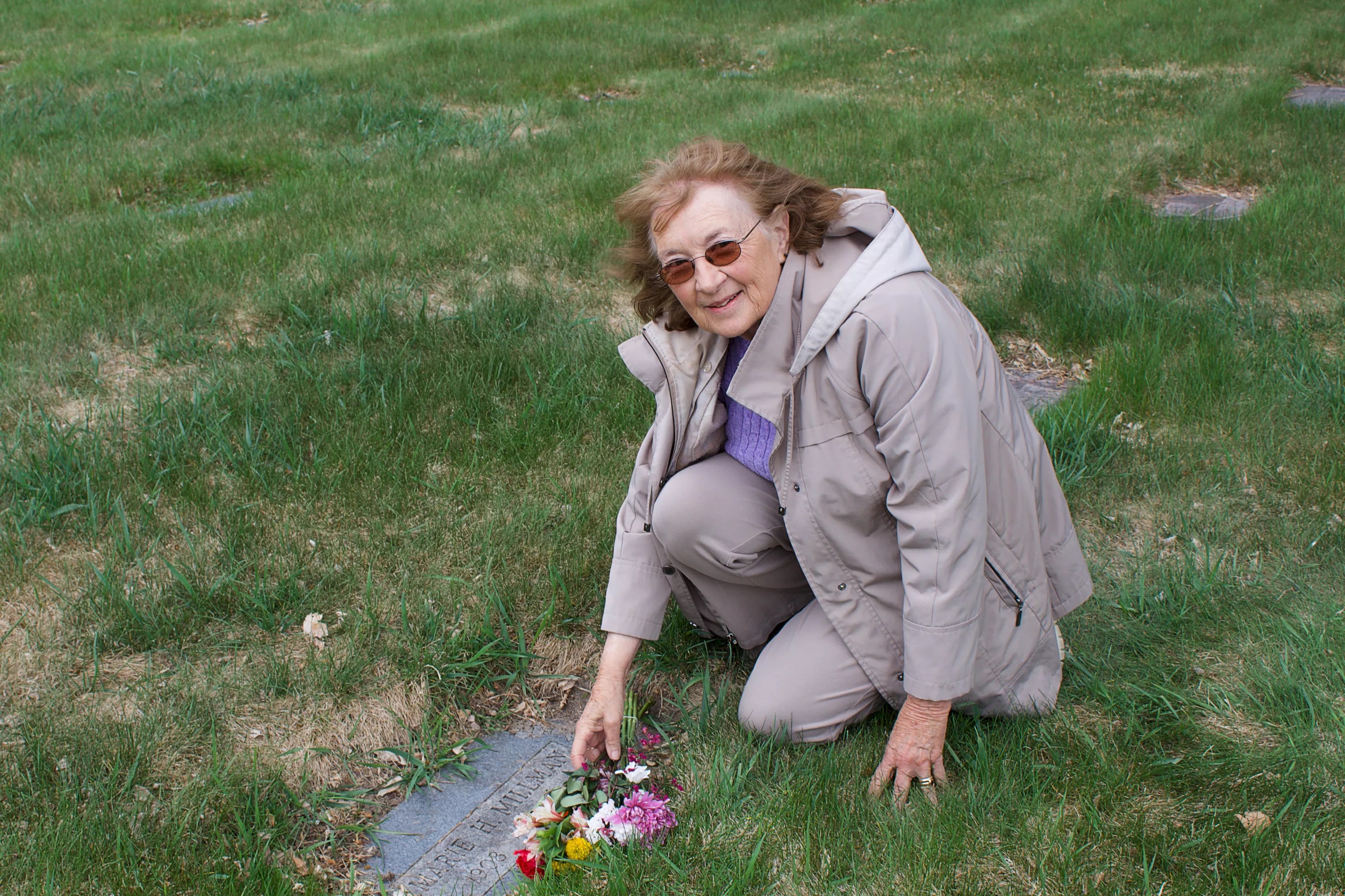 Silvia Pettem poses next to Marie Millman’s grave after laying down flowers in April 2025.
