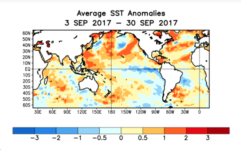 So first of all, do we have an El Niño or a La Niña? Study the map above: Look at the colors and focus on the central Pacific Ocean.