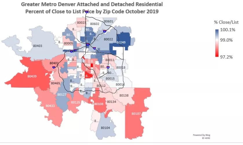 As for the top end of the scale, it sits at 100.1 percent – an indication of zip codes where the average was above list. That was the case in 80249, whose neighborhoods include Gateway and Green Valley Ranch. The prices there were among the most reasonable in the city, hovering around $300,000. But this stat demonstrates that the list there is mighty solid these days.