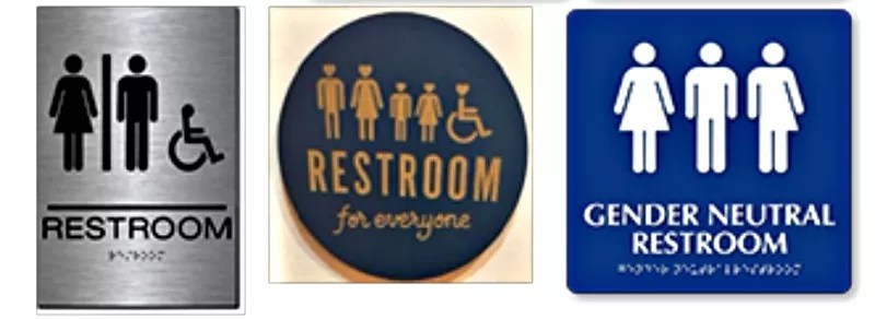 “People can get really creative – and I’ve seen a couple of ones around town that are pretty cute,” Swartz says. “But the only thing you can’t do is imply a gender through a picture or text. If it’s an ADA [Americans with Disabilities Act] bathroom or a family bathroom, you still have to somehow state that’s the case. But it doesn’t have to use the phrase ‘gender-neutral.’ If you only want to use the word ‘restroom’ or ‘toilet,’ that’s fine, as long as you’re not saying it’s for only men or only women.”