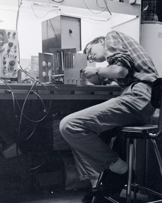 At age nineteen, Tim Scully, seen here calibrating equipment in 1964, was already skilled at electronics work.
