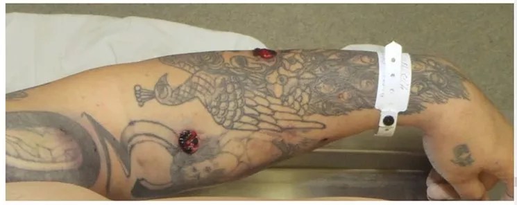 Denver DA Mitch Morrissey used the bullet holes in Dion Damon’s arm, as seen in this post-mortem photo, in his decision letter that found Officer Jeffrey Motz’s actions justified.