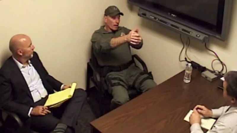 During his post-shooting interview, Officer Jeffrey Motz can be seen demonstrating a two-handed stance while describing his fatal encounter with suspect Dion Damon.