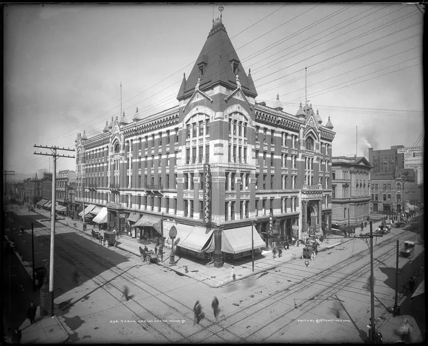 On the rough-and-tough frontier, opera houses were considered symbols of civilization. Central City had one, Leadville had one, and Horace Tabor gave Denver a great one: the Tabor Grand Opera House, at 16th and Curtis streets. The stunning structure opened in 1881, a dozen years before Tabor lost his fortune in the Silver Crash of 1893. (He lost his shot at a political career after he left wife Augusta for Baby Doe.) In 1961, the Tabor Grand itself came crashing down, one of the first losses in a decade that disappeared many historic buildings from downtown Denver, replacing them with surface parking lots…and in the process paving the way for the preservation movement.