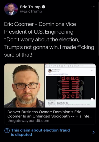 Numerous members of Donald Trump’s campaign staff and supporters, including Eric Trump (see tweet below) repeated that since-disproven claim, propelling a narrative that Dominion machines, which are used in states across the U.S., flipped votes from Trump to Biden. Local figures, too – including Mesa County Clerk and Recorder Tina Peters, who called Coomer out by name in a January 3 tweet – have perpetuated the rumors.