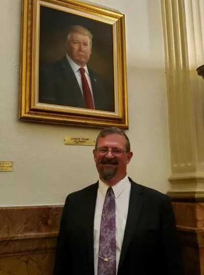 Senator Kevin Grantham poses beneath the new portrait of President Donald Trump.