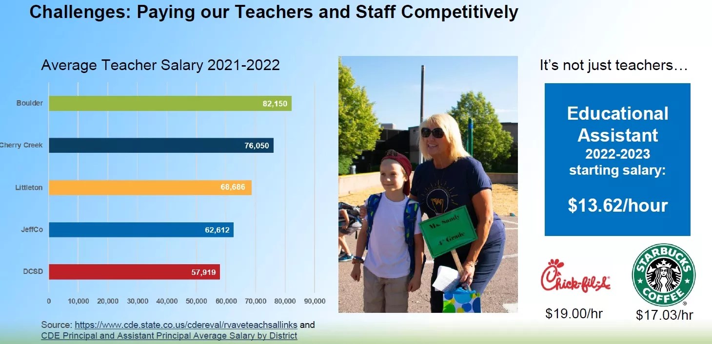 This situation isn’t unique. During the week of August 9, more than 2,000 jobs were unfilled in metro area school districts, creating a competitive situation in which Douglas County has a distinct disadvantage. The district staff’s presentation reveals that the average pay for a Douglas County teacher, just under $58,000, is nearly $25,000 lower than in Boulder, and thousands less than in at least three other metro districts. Dougco’s starting salary of $13.62 for educational assistants, also known as paraprofessionals, is not only well below that of the Denver Public School District, where the wage was just bumped to $21, but also less than what’s being offered for employees of Chick-fil-A and Starbucks. See the numbers in the graphic below: