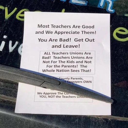 Douglas County instructors who participated in the sickout have been castigated by supporters of the conservative boardmembers, and so has the Douglas County Federation, the area’s main teachers’ union. For example, fliers declaring that “ALL Teachers Unions Are Bad!” were placed on the windshields of cars painted with messages supporting the February 3 protest. As noted by Denver7, Peterson criticized the fliers at the February 16 special meeting, saying, “This is no way to move forward as a district. Our teachers should be respected and supported for the work they do for our students every day, and we hope the community can come together in support of our teachers.”