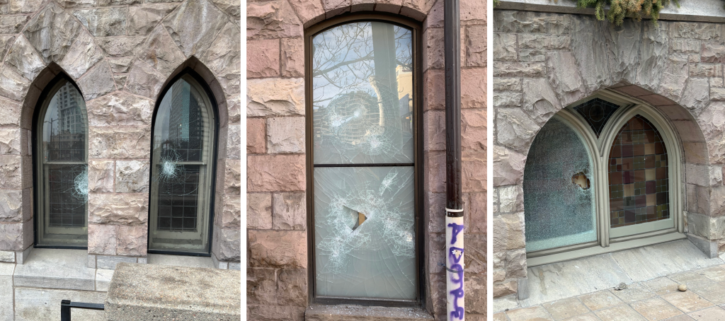 Someone attacked the church’s stained glass windows on January 4 and January 7, Smith says. In one case, the vandal managed to break through the protective barrier and damage 140-year-old glass behind it. Smith estimates the repairs will cost upwards of $8,000.