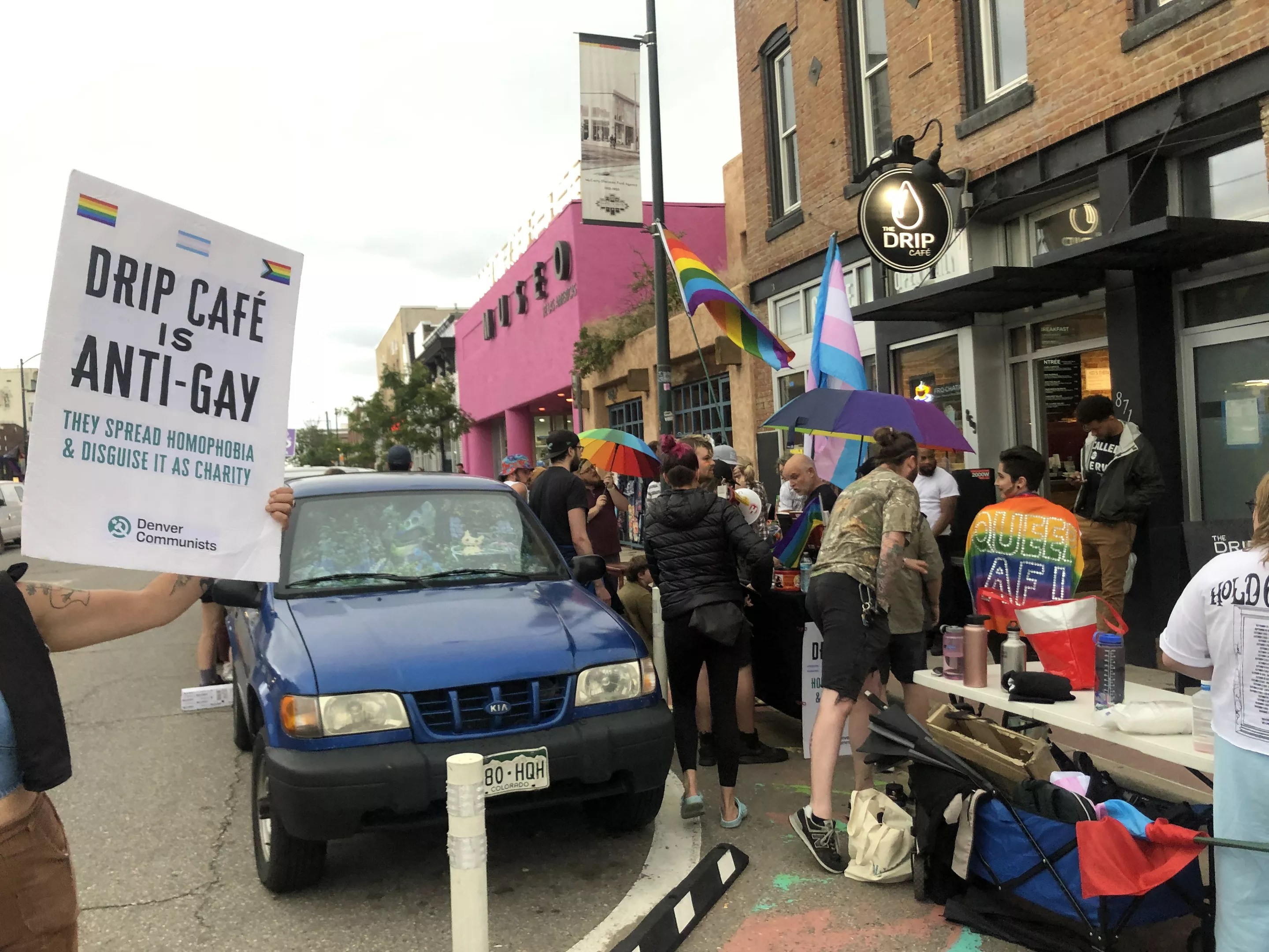 LGBTQ+ supporters gathered outside The Drip Cafe on Friday night, July 7, to protest the Christian coffee shop’s “anti-gay” mission statement – marking the second time the Drip has been targeted by demonstrators during the First Friday Art Walk on Santa Fe Drive.