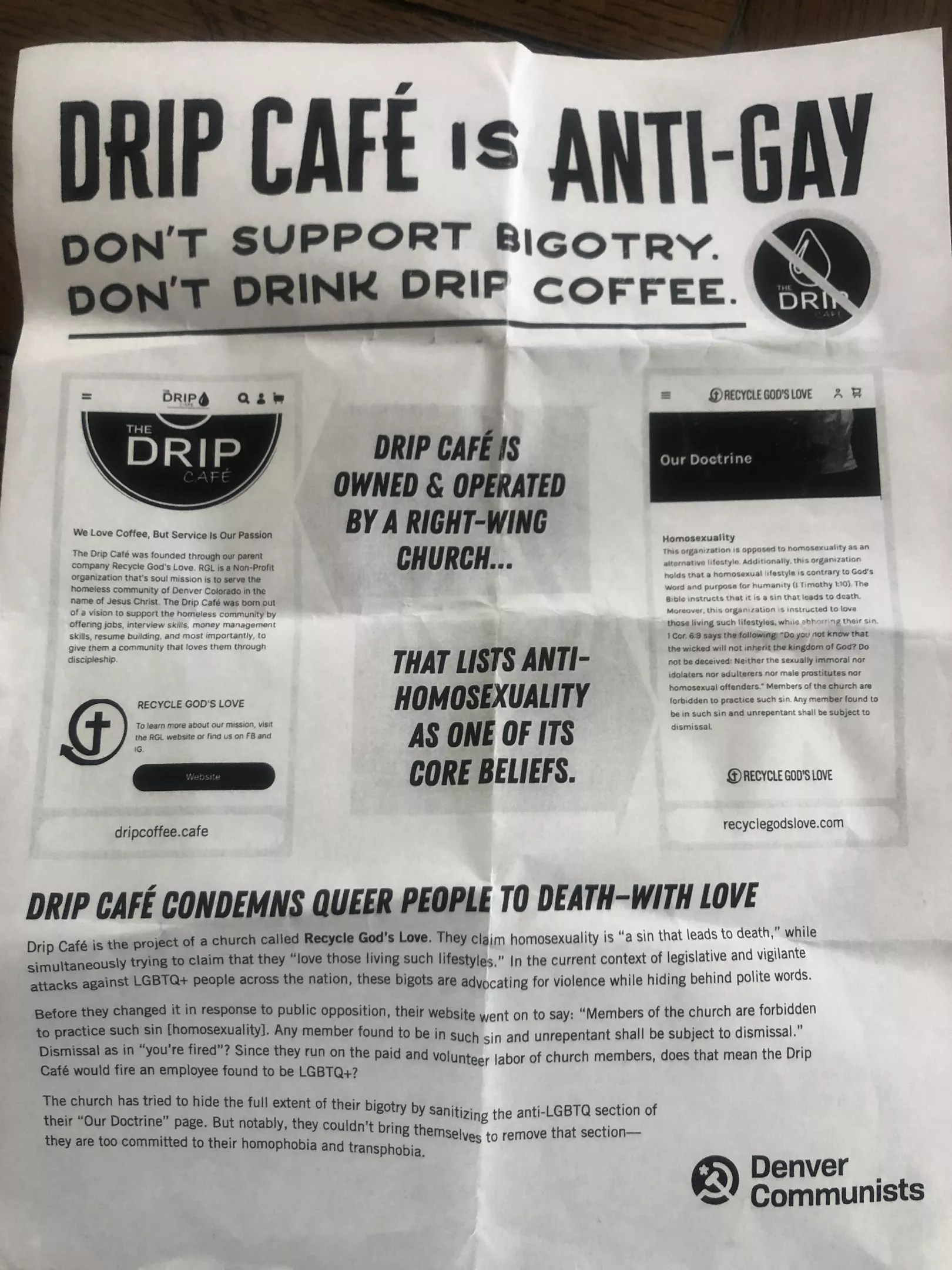 According to Chelsea Jacobs, a protester who’s been working for over three years with the Denver Communists, the group behind the demonstrations: “For about a month, the Denver Communists have been running a campaign against this cafe because it is bigoted; it is shrouded as a charity organization. It is a for-profit cafe, a front for a right-wing, bigoted church that is against the queer community. And we, as communists, believe in queer liberation. We believe in human liberation for all. And we think that as long as there is hatred against queer people, we are all oppressed.”