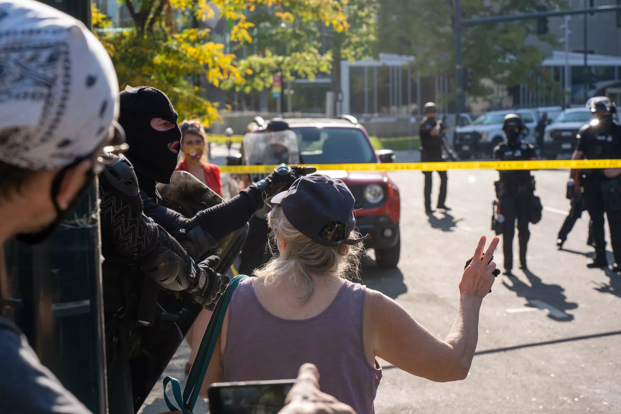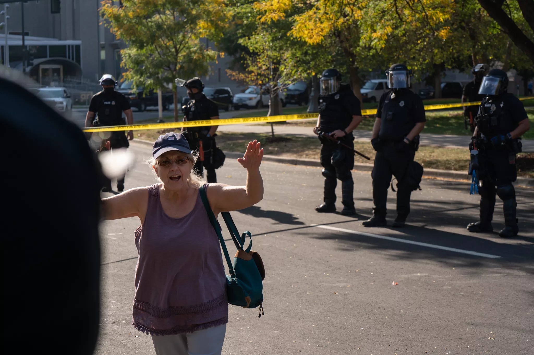 Shortly after the shooting, Linda Sneed, who had no affiliation with either protest, moved into the tense space between the shouting protesters and the police.
