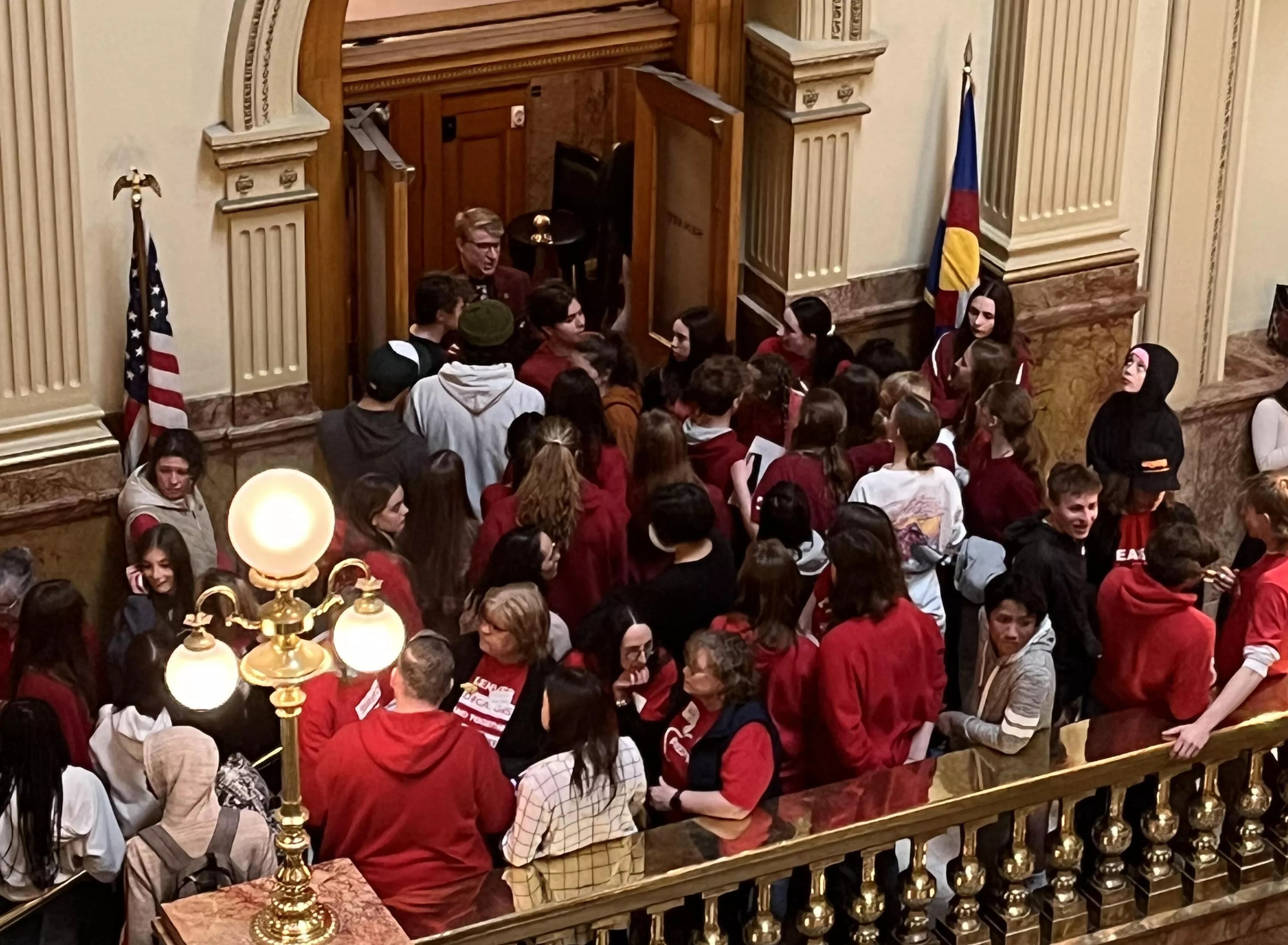 On Thursday, March 23, I stood next to Kate Mimken, the mother of a sophomore and a senior at East High School, as we looked from the third floor of the Colorado State Capitol down into a flurry of teenagers dressed in red. It was the second time we had been at the Capitol in three weeks. The day before, at 9:45 a.m., two deans had been shot on the first floor of East High School after a routine pat-down of a student. They were taken to the hospital, where one had emergency surgery. I started chatting with Kate about her experience as a parent with two children in a lockdown while a shooter was in the building.