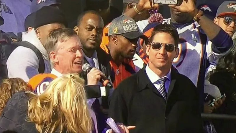 Ed McCaffrey alongside Governor John Hickenlooper at the February 2016 celebration of the Broncos’ victory in Super Bowl 50.