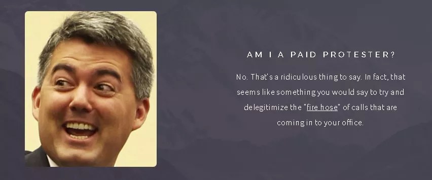 Immediately thereafter comes “Who Owns Cory Gardner,” which links to donation details regarding “Oil & Gas, Big Banks, Telecoms” and the question, “AM I A PAID PROTESTER?” The answer to the latter: “No. That’s a ridiculous thing to say. In fact, that seems like something you would say to try and delegitimize the ‘fire hose’ of calls that are coming in to your office.”