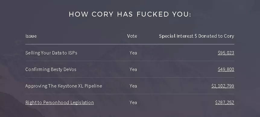 The site follows the graphic at the top of this post with a clock counting down the days, hours, minutes and seconds to election day in 2020, plus links allowing visitors to share their thoughts with Gardner via phone, e-mail, Twitter and Facebook. Next comes a section titled “How Cory Has Fucked You,” boasting four categories – “Selling Your Data to ISPs,” “Confirming Betsy DeVos,” “Approving the Keystone XL Pipeline” and “Right to Personhood Legislation” – supplemented by the amount of money he’s accepted from groups backing the positions he ultimately took.