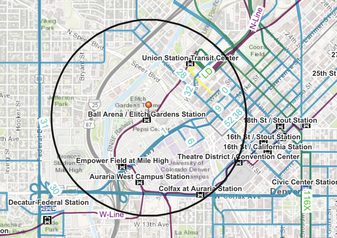 There are around 100 transportation options around Ball Arena, and RTD will help you plan the route.