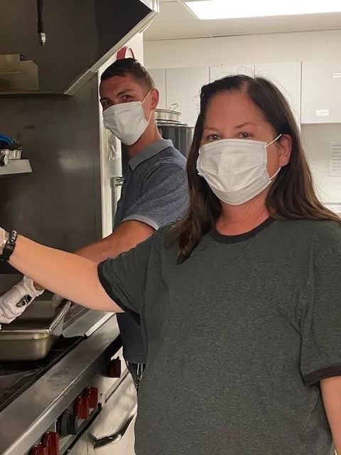 Two volunteers preparing meals at Loaves and Fishes Ministries.