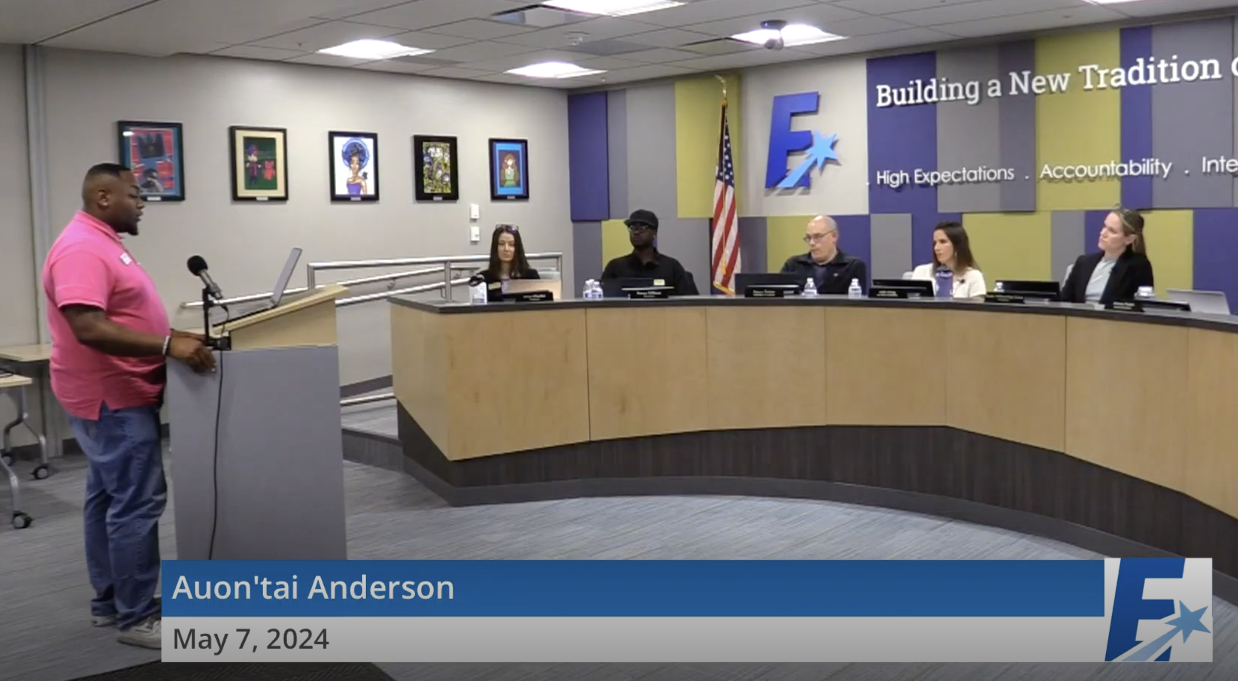 “We have watched from afar, and have watched this individual – who is not perfect, he’s had his own struggles – but we’ve watched the treatment of this Black school board member being different than that of his white counterparts, and we are very concerned about the ongoing treatment of this individual, who has been duly elected and consistently has to face several aggressions from his colleagues,” Anderson says.