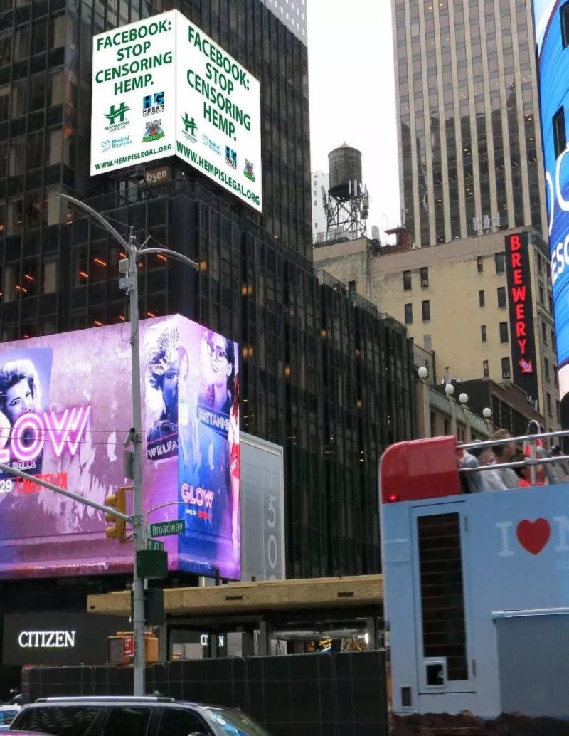 Lanier isn’t joking: Since 2015, her organization has been trying to meet with Facebook representatives, but has been unsuccessful. Now the HIA has paid for a digital billboard in New York City’s Times Square that will run daily through August 24, reading “Facebook: Stop Censoring Hemp.”