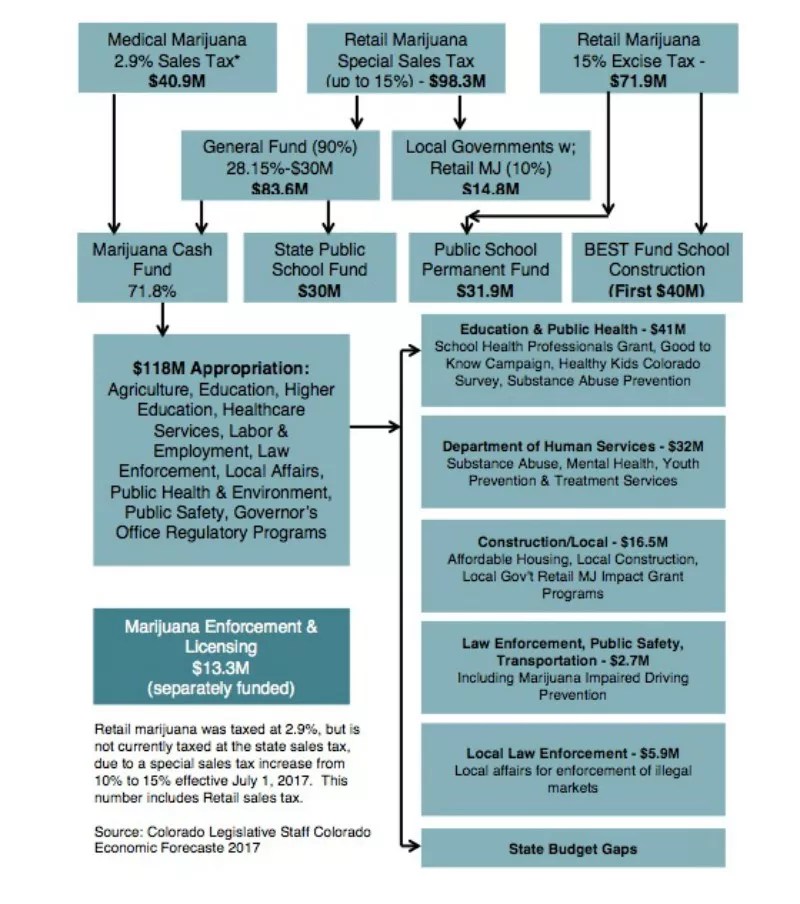 The MMJ sales tax pours entirely into the state’s marijuana tax fund, which appropriated $118 million to a wide variety of government functions. Around $41 million went to education and public health via a school health-professionals grant, the Good to Know campaign, a Healthy Kids Colorado survey and assorted substance-abuse-prevention efforts.