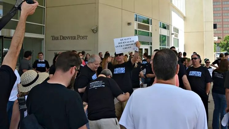 A past demonstration against Alden Global Capital outside the old Denver Post building.