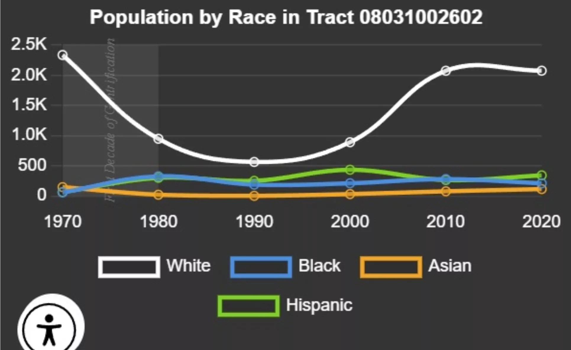 Nationwide, gentrification often results in what Mitchell describes as “a racial turnover in Black-majority neighborhoods.” He estimates that there are now at least 261,000 fewer Black people living in neighborhoods where that demographic was the majority in the 1970s, with total displacement of the group potentially reaching a half-million across the country. By sheer numbers, Denver contributed a relatively small portion of this amount – around 8,000 displaced Black residents, Mitchell says. But that represents well over 10 percent of the 62,785 Black people living in Denver in 2023, as counted by the U.S. Census Bureau, and involves a wide swath of the city.