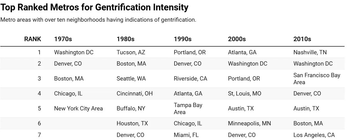 “Denver has been a consistent city that has appeared on the list since the 1970s,” Mitchell says. “When we look at Denver from the 1970s and 1980s, we find a downtown core area that’s undergone gentrification, and it’s spread outside that core since then. Gentrification has been particularly intensive in Denver over the long term.”