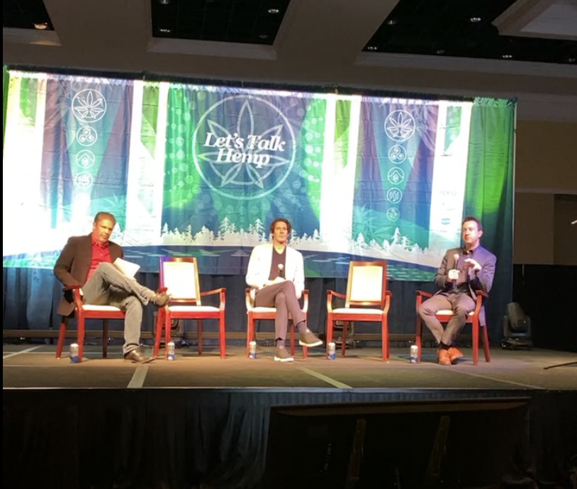 NoCo Hemp Expo organizer Morris Beegle (left) holds a Q&A discussion with Charlotte’s Web co-founder Jared Stanley (middle) and MLB head of drug prevention and treatment Jon Coyle at the Broadmoor resort on March 29.