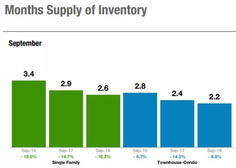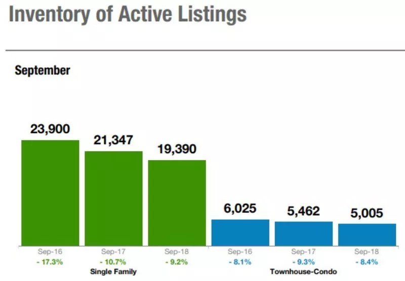 The supply of single-family homes is estimated to last 2.6 months, with townhouses and condos registering at 2.2 months. Meanwhile, the active listings in September for single-family homes (19,390) and townhouses and condos (5,005) represent drop-offs of 9.2 percent and 8.4 percent from the prior year.