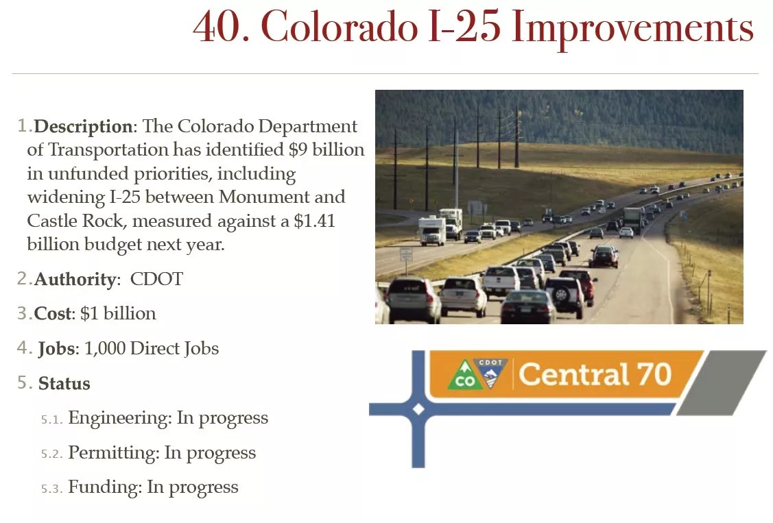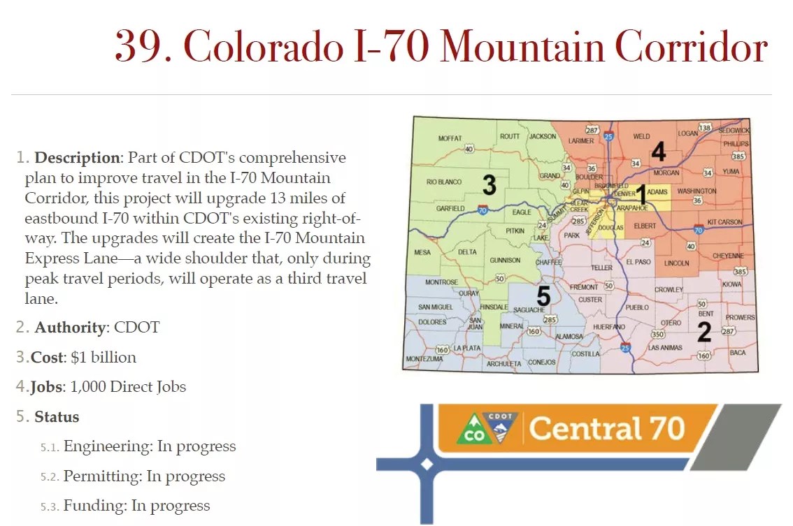 Take the “I-70 Mountain Corridor” entry, designated the 39th-highest infrastructure priority in the nation: