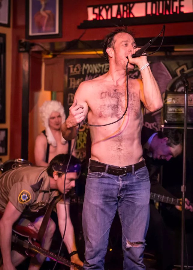 Meyer – who goes by the stage name “The Kid” – is quite the presence on stage, known to flop, flail, scream, cavort and writhe on the ground. “It’s always an interesting scene when we do a show,” says Blake Pendergrass, aka “Bonedogg,” the band’s drummer, who also plays in a Latin ska band called Roka Hueka. All five members of Wild Lives either work in the legal field or have done advocacy work for nonprofits.