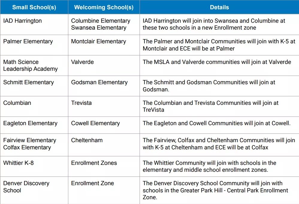 While students from closing facilities will be automatically enrolled in “the welcoming school,” families will “still have the option to choose a different school using the standard School Choice process,” the plan pledges. But DPS contends that the combined schools will have significant advantages, as outlined by the following bullet points: