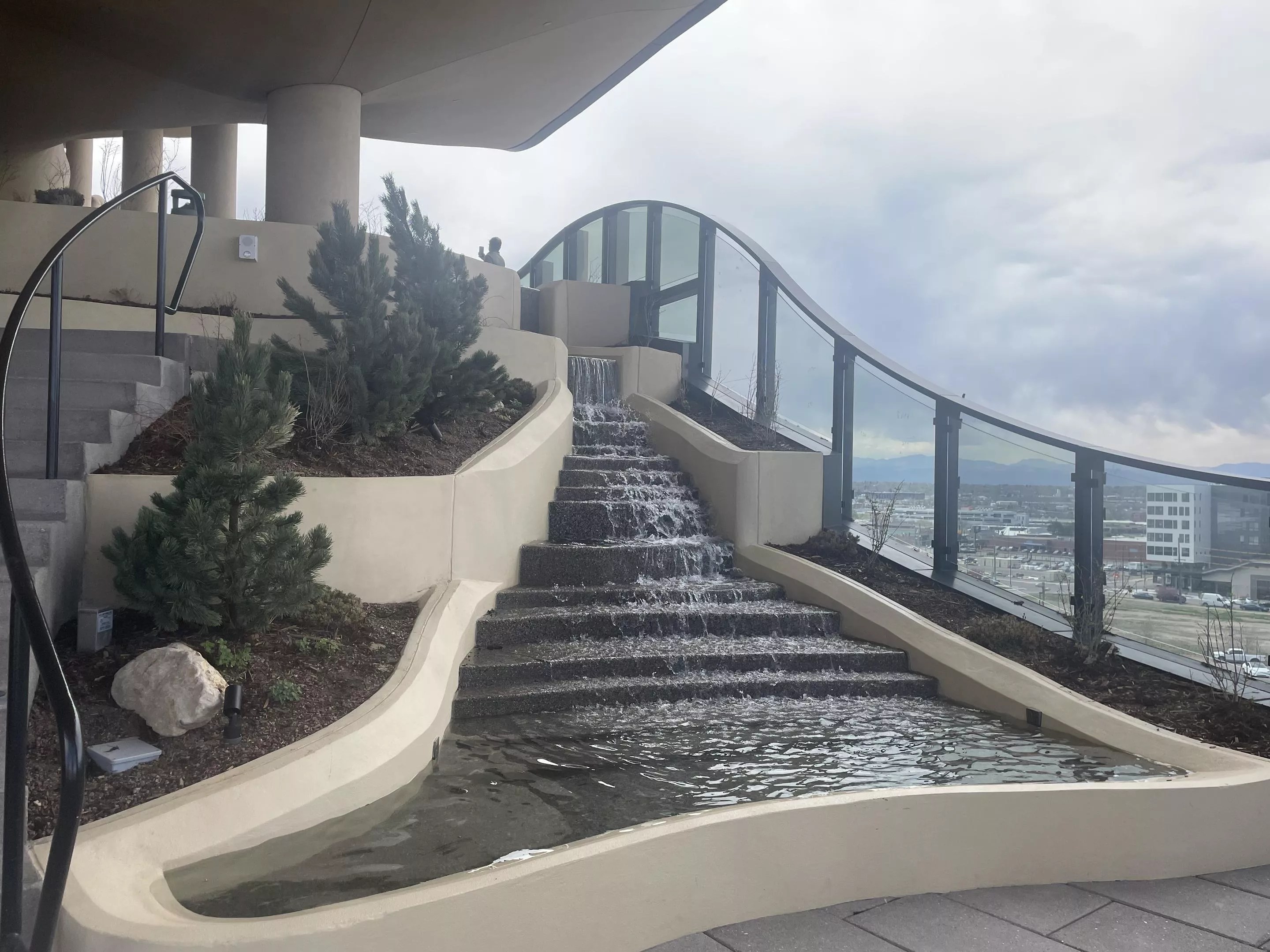 Up close, the canyon isn’t quite as luscious as the renderings that got people so intrigued, but the plants are still young and will have a bigger visual impact as they grow. Additionally, the pool and rooftop community space is still under construction, though the plan is for it to be fully ready by the end of May. BrightView is the exterior landscaping contractor.