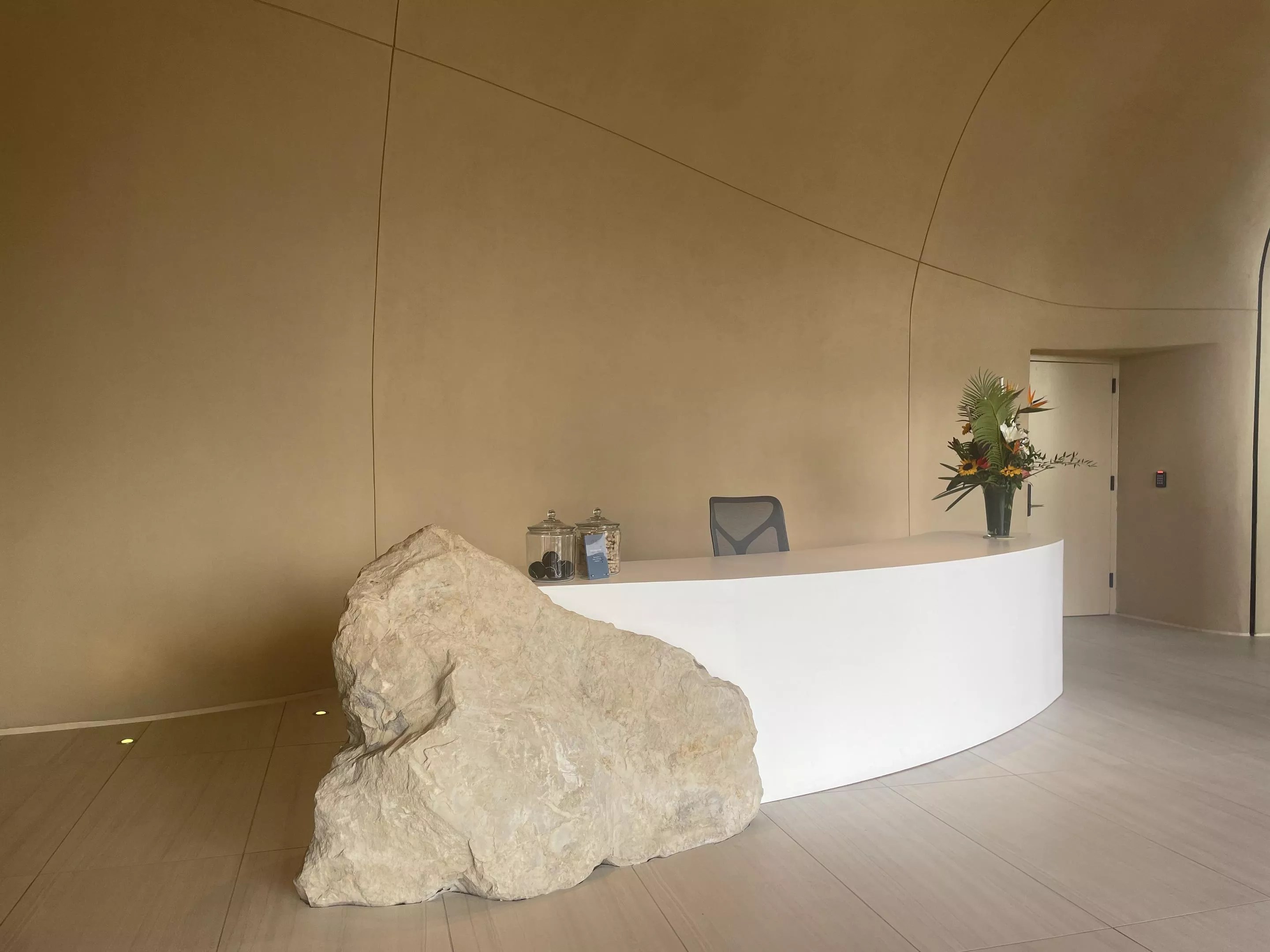 The lobby feels like a cave, with sloping walls and ceilings also washed in the dirt color scheme. A giant stone anchors the white reception desk; according to Young, the stone was one of the first things placed in the building using VR goggles while construction was built around it. The management team could not confirm where the rock came from, but members said they were fairly sure it was excavated during the construction process at One River North.