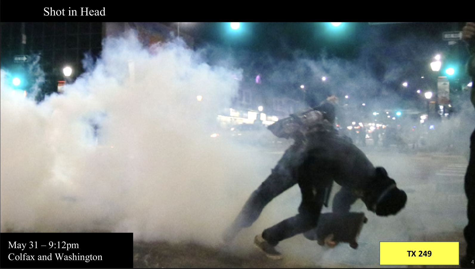 “Packard had been protesting near downtown Denver,” the ruling explains. “A police officer threw a tear gas canister near Packard, which Mr. Packard kicked ‘away from himself and other protesters, in the direction of a line of officers.’ Immediately after kicking the canister, Mr. Packard was hit in the head with a beanbag round fired from a shotgun; the round knocked him unconscious and caused major injuries.”