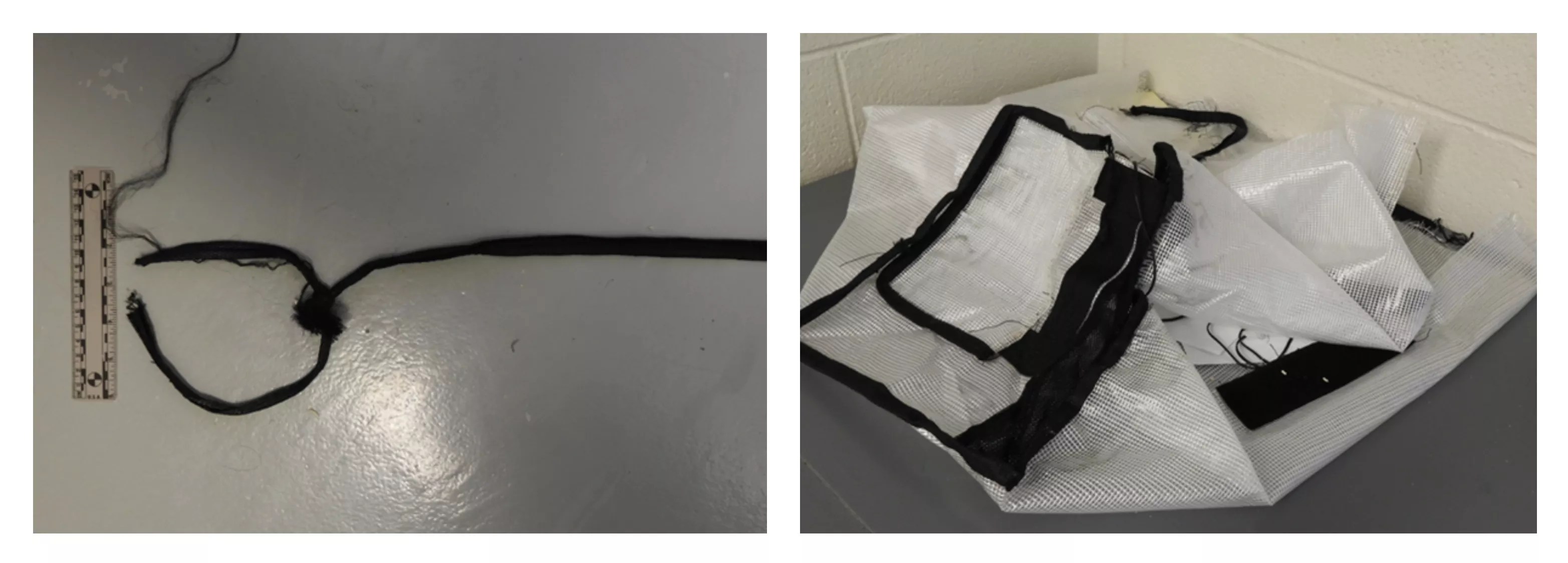These photos illustrate the clear plastic bag and black rope that Harmon used to hang himself.