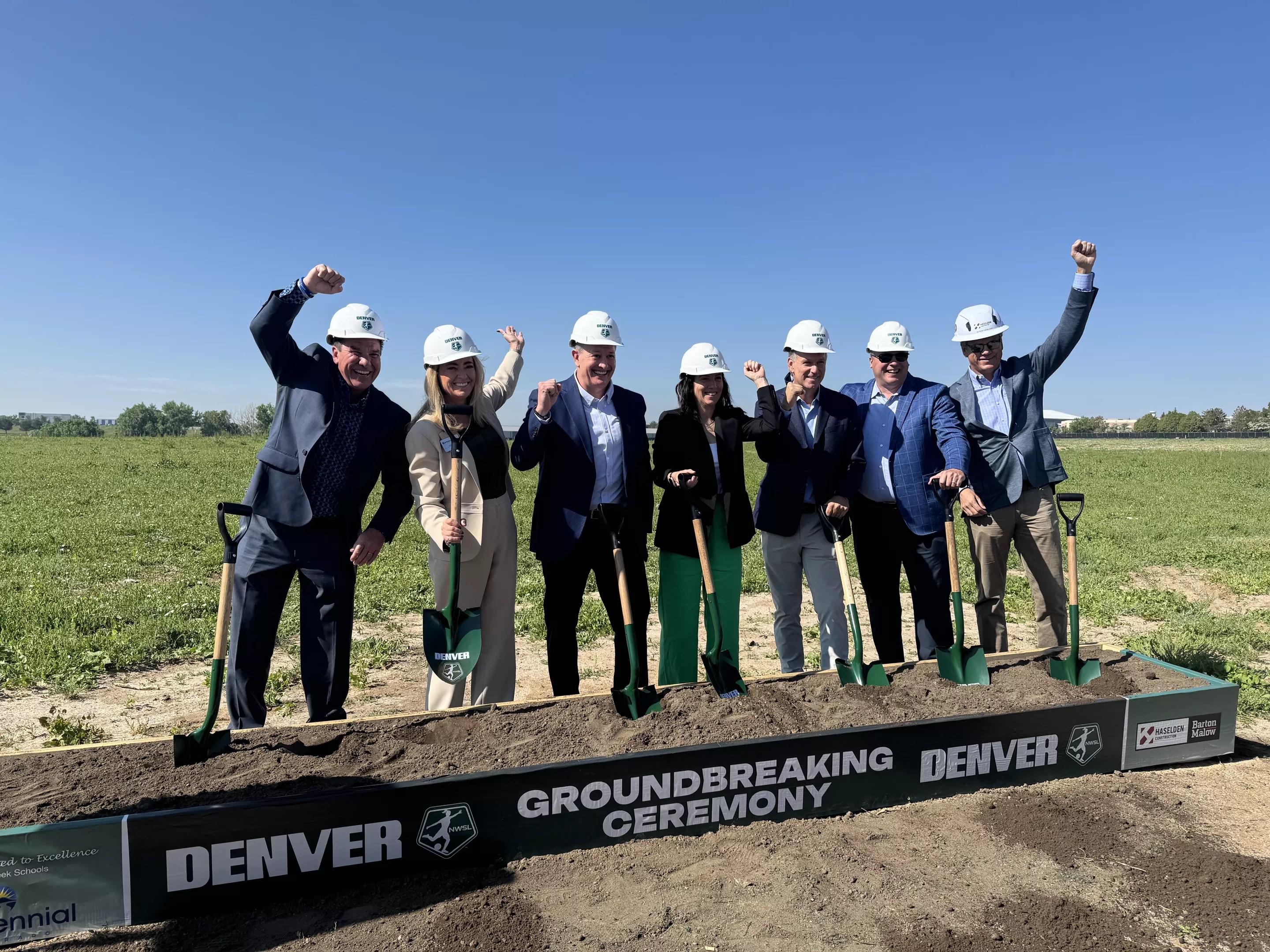 Denver NWSL owner Rob Cohen (third from left) celebrates after breaking ground on the team’s training facility in Centennial on June 9.