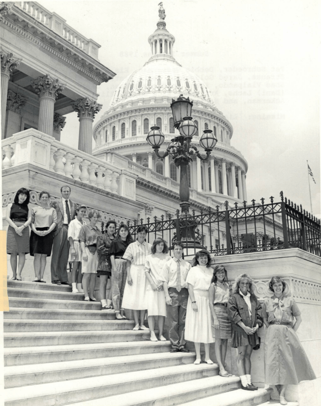 Sanae Takaichi (far left) with then-U.S. Representative Pat Schroeder (back middle) in 1988.