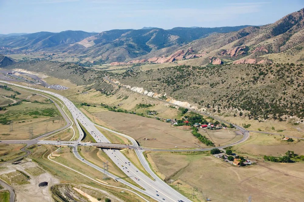 An aerial view of the interchange property, looking southwest; Dinosaur Ridge is to the left, with the visitor’s center in the foreground.