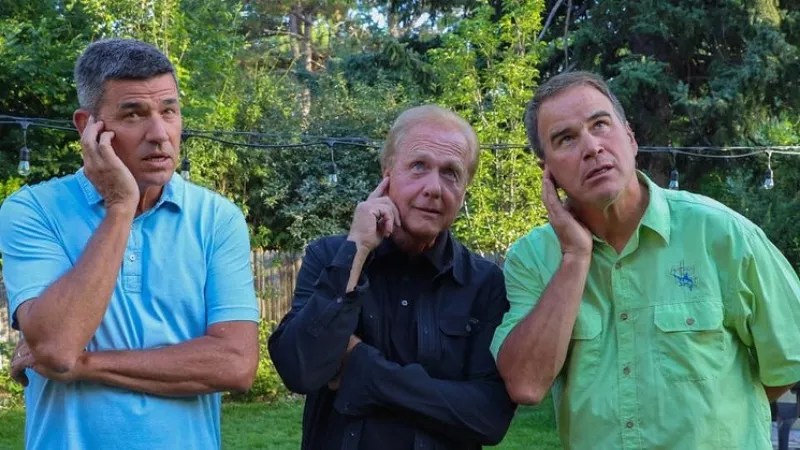 A 2017 photo of 9News anchor Tom Green, former 9News anchor Mark Koebrich and Jim Benemann engaging in a “‘Newsman Pretending to Listen to Producer’ competition.”