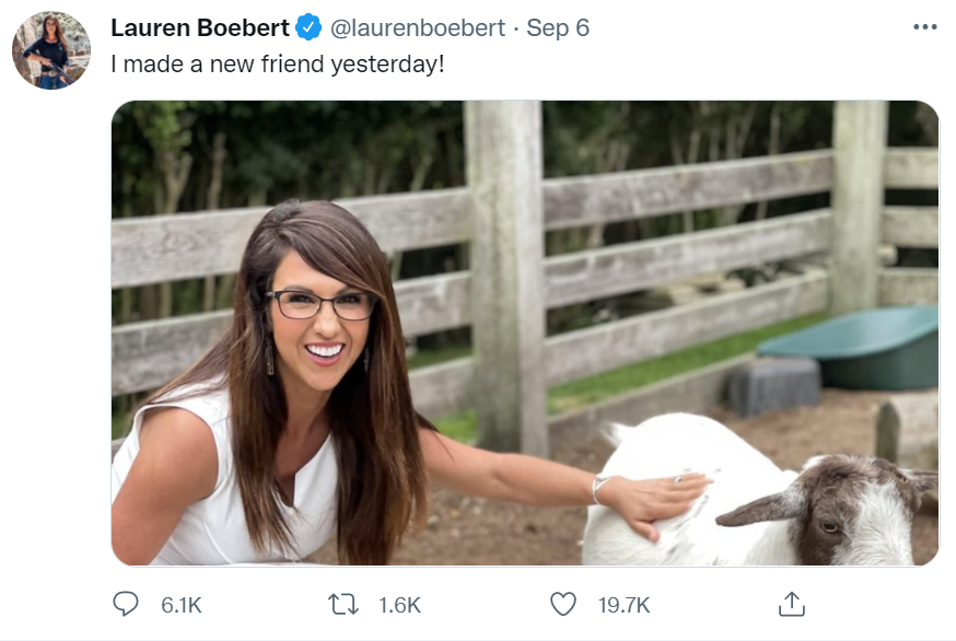 Boebert recently came out with the brave stance that she’s firmly pro-goat. Neguse has so far remained silent on any and all capra hircus issues. The goat in Boebert’s photo – not a supporter, based on body language – later released a statement that read in part: “I had serious questions about her seemingly inconsistent comments on border security during the two recent administrations, but she just kept smiling for the camera.”