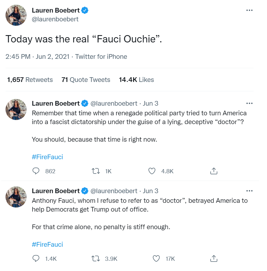 Speaking of bullshit conspiracy theories, Boebert and Neguse are starkly divided on how the pandemic should be handled. While Neguse has firmly supported the science in terms of prevention, treatment and dealing with the economic impact, Boebert has shifted her position with the prevailing right-wing wind. First, it wasn’t a big deal. Then it was, but it was the Democrats’ fault, then China’s, then both. Her record is hard to track on the issue, because it’s neither linear nor logical. These days, she’s mainly focused on the idea that masks and social distancing are “fake news,” and that immunizations and Dr. Anthony Fauci are fascist frauds, and she continues to belittle the importance of the vaccine by calling it a “Fauci Ouchie.” It’s a hallmark of Boebert’s first term that she clearly – and wrongly – thinks what she says is super-cute and clever. The adults in the room disagree.