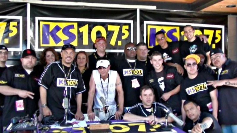 The KS-107.5 crew circa 2008. Kendall B is standing by the microphone to the left, while Kathie J is over his right shoulder and Larry Ulibarri is seated with his arms on the table.