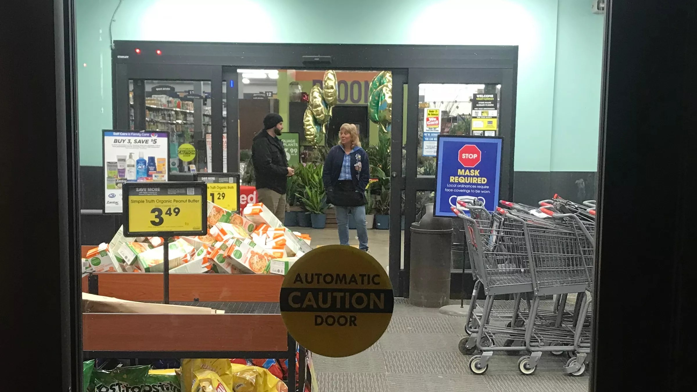 King Soopers managers looking at picketers through the locked front doors of a southwest Jeffco store before opening time on January 12.
