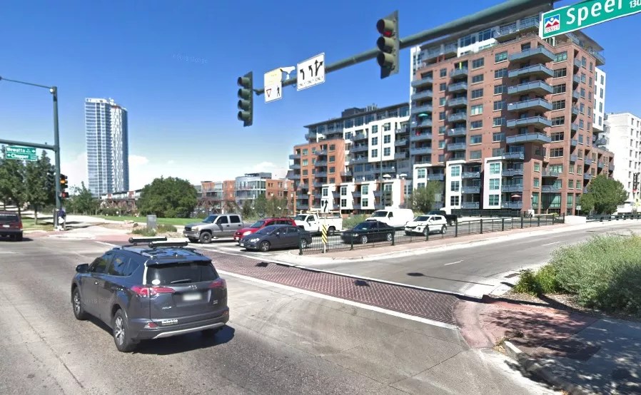 Speer Boulevard at Wewatta Street could soon be the site of a pedestrian bridge.