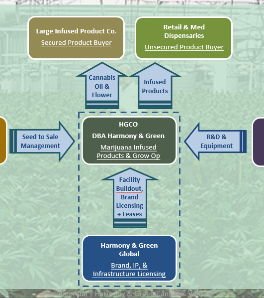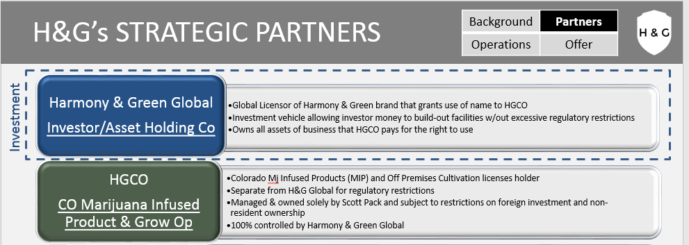 Update: As noted above, Scott Pack reached out to us after the publication of this post to share graphics provided to potential investors in Harmony & Green LLC, including Pierre Raygot. As he points out, the slides make it clear which entity holds the investment and which one holds the licenses (HGCO LLC).