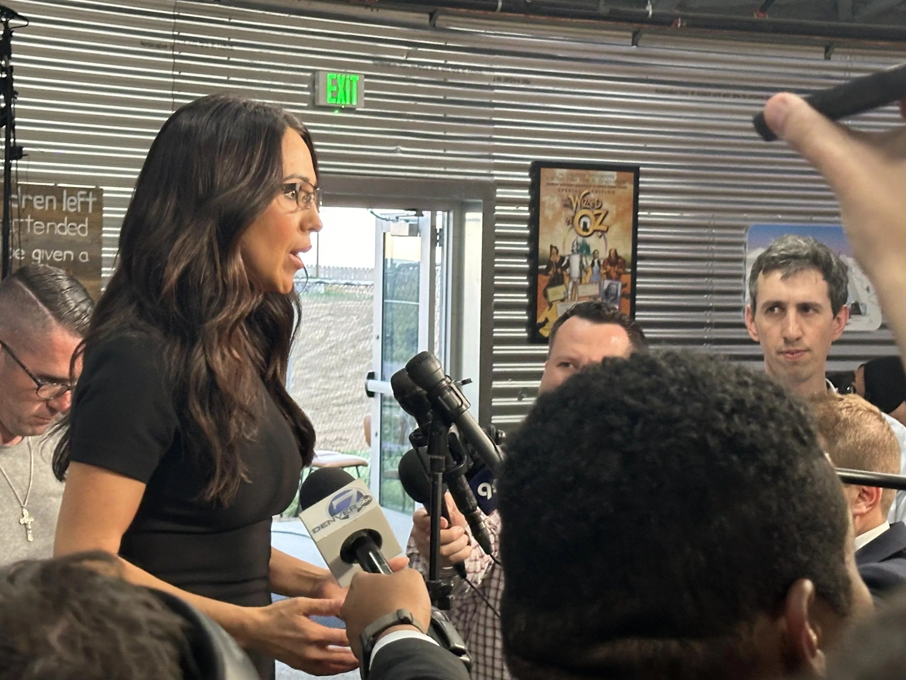 Lauren Boebert speaks to media during her June 25 election watch party.